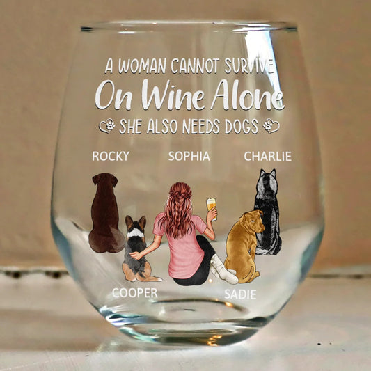 A Woman Cannot Survive On Wine Alone Dog Mom - Personalized Stemless Wine Glass