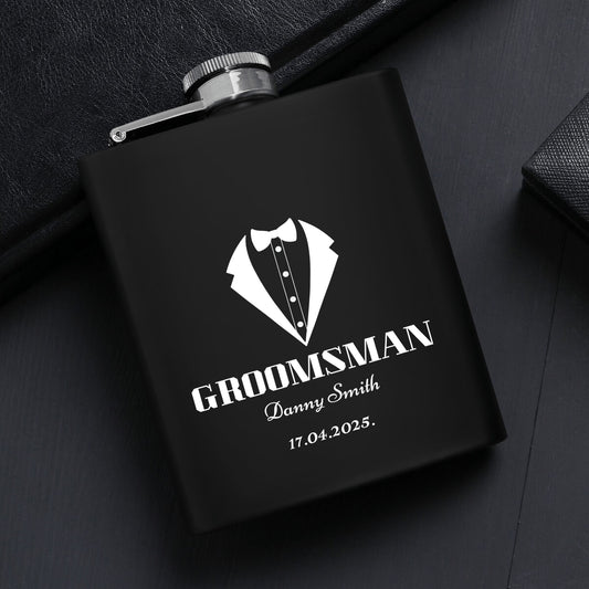 Personalized Groomsman Hip Flask Set – 7oz Black Stainless Steel with Gift Box & Custom Engraving