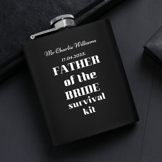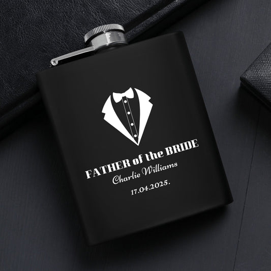 Personalized Father of the Bride Hip Flask Set – 7oz Black Stainless Steel with Gift Box & Engraving