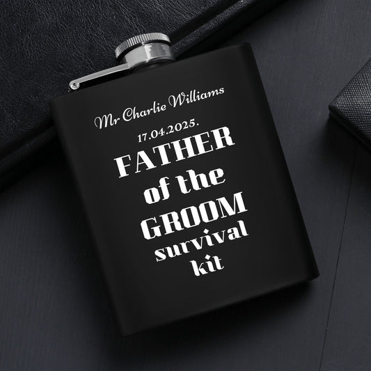 Father of the Groom Survival Kit – Personalized 7oz Black Hip Flask Gift Set with Funnel, Cups & Gift Box