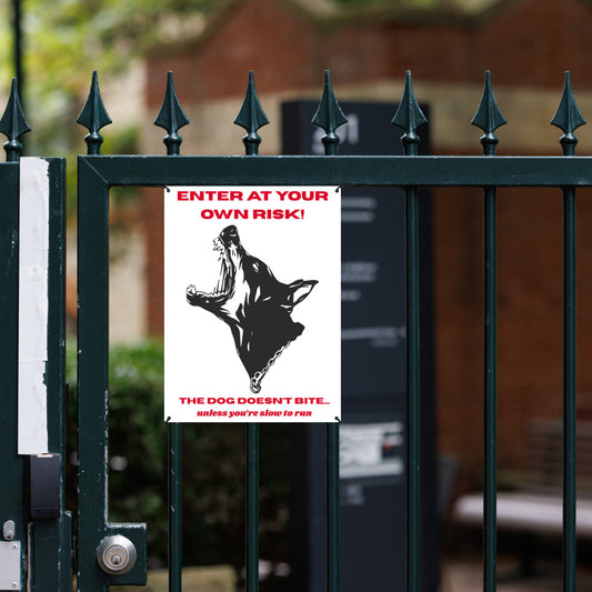 Dog Warning Sign – Funny Metal Guard Dog Sign for Fence or Gate | “Enter at Your Own Risk” Outdoor Pet Safety Plaque Dog Warning Sign – Funny Metal Guard Dog Sign for Fence or Gate | “Enter at Your Own Risk” Outdoor Pet Safety Plaque