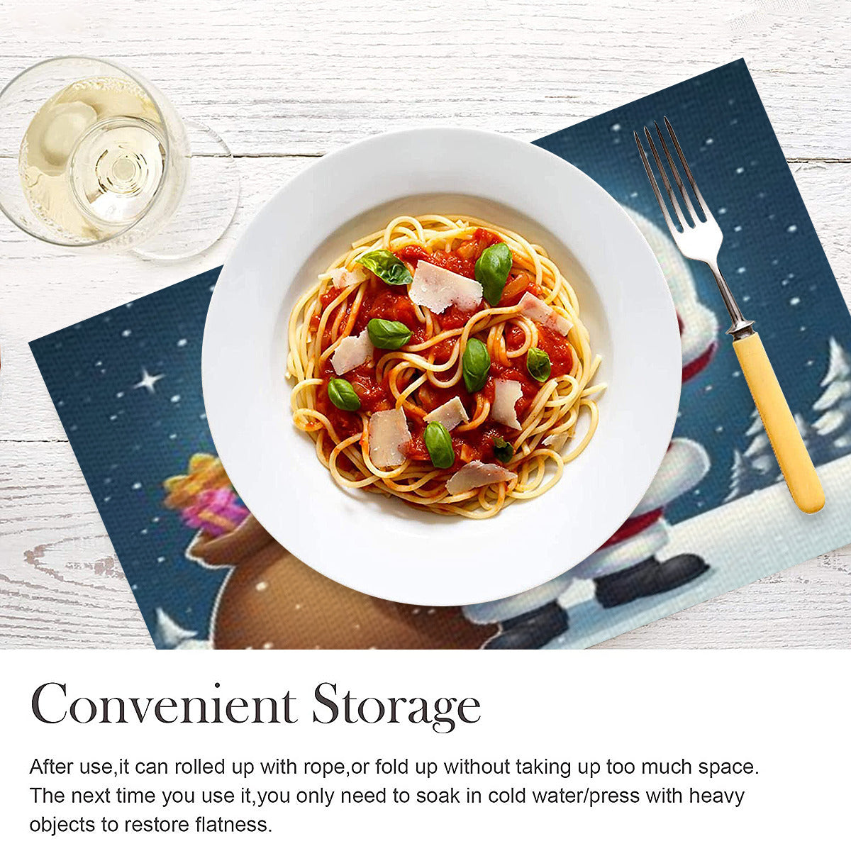 Each placemat features vivid, finely detailed Santa Claus artwork created through an advanced printing process. The result is a striking and cheerful design that instantly lifts the atmosphere, whether you’re hosting a Christmas dinner, a winter wedding, or a casual family meal. More than just decoration, these placemats are simple to maintain—just wipe them clean to keep them looking their best, time after time.